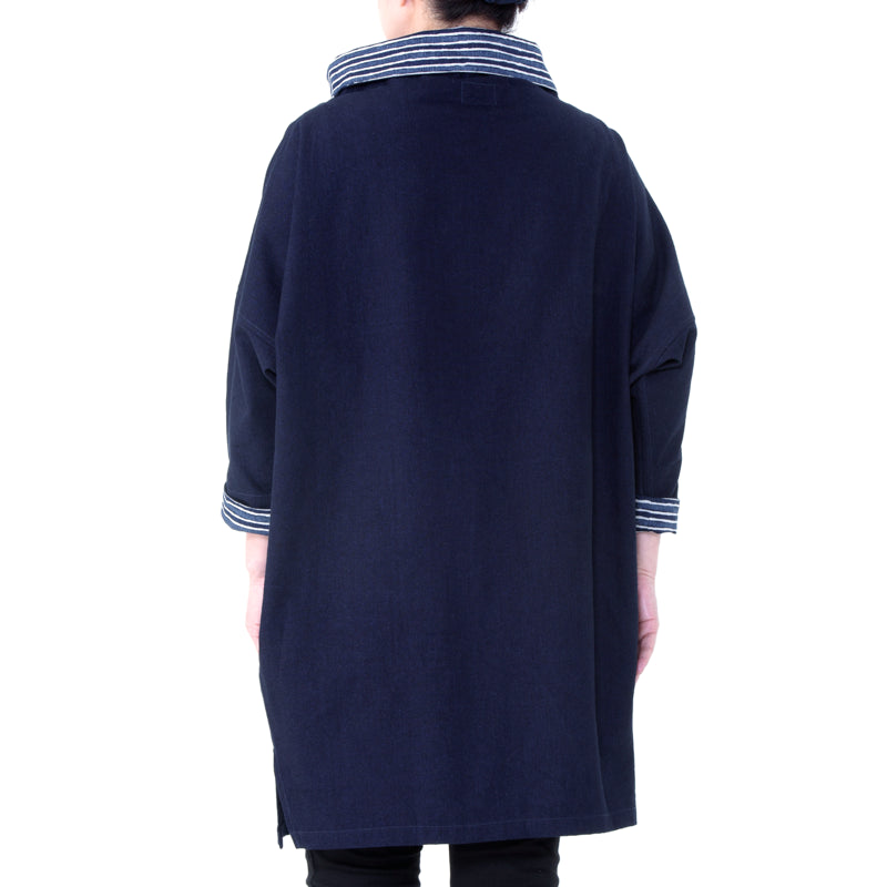 The 100% cotton indigo dyed bust is a loose design that hangs on the hem. There is one pocket. Collar • You can see the pattern by folding the cuffs. Please let us know the size around your head due to the design. Slits are available upon request. * French sleeve.