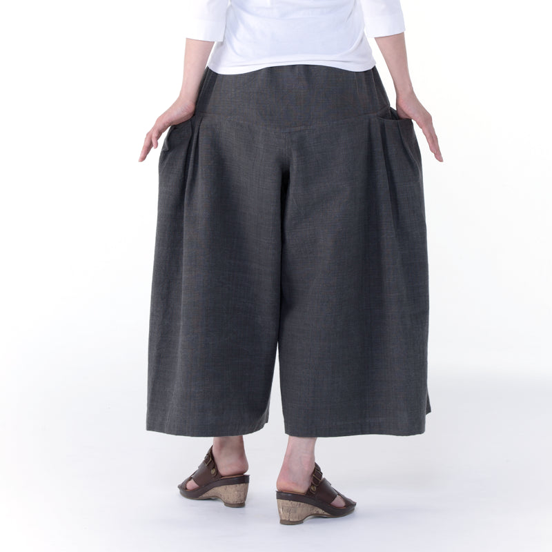 100% cotton Bamboo charcoal dyeing Bamboo charcoal dyed fabric is used. Wide pants that look like a skirt with pockets on both sides as the boundary. The waist (waist width) has a rubber finish, so it can handle approximately 60 cm to 95 cm.