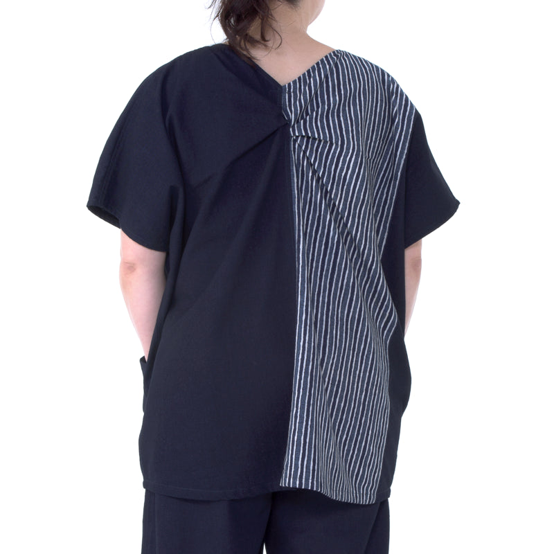 100% cotton indigo dyeing The front side is simple and points are attached to the back side, and the neck area is wide open. There are 2 pockets. * This design is a French sleeve